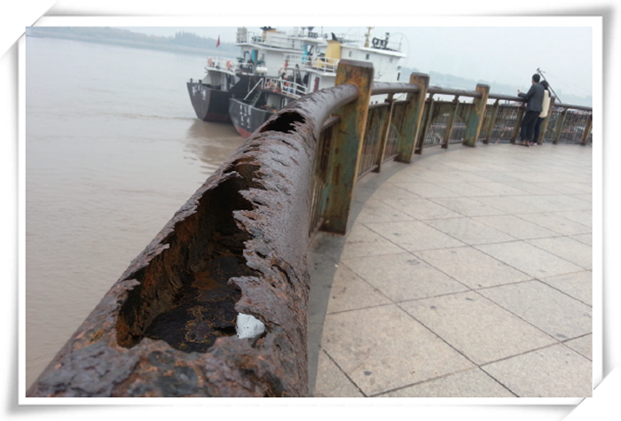 作为发祥地的江苏长江地区,沿江沿海地带很多,记者在江边拍到这样的斑驳锈迹护栏,附近还有情侣倚栏赏景,安全随时让人担忧。附近居民也认为,护栏本来是维系安全警示路人作用的,这样的护栏万万不可用在潮湿地使用。
