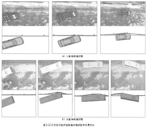 图2-2-12为小客车和大客车碰撞护栏过程图,可见车辆碰撞双层波形梁护栏后逐渐转向并驶离护栏,围墙护栏对车辆形成良好阻挡和导向作用,计算机仿真结果与试验结果基本一致。