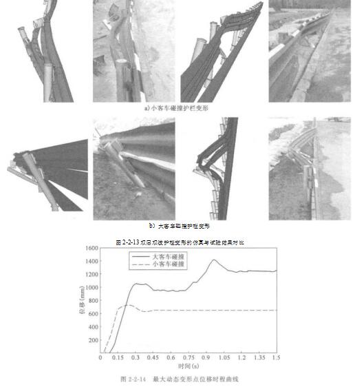 图2-2-13为双层双波护栏变形图,可见小客车碰撞后下层波形梁板变形较大,上层波形梁板变形较小,说明下层波形梁板对于小客车防护起主要作用;大客车碰撞后, 上层波形梁板和下层波形梁板变形比较平顺,说明上下两层波形梁板协同对大客车进 行有效防护;计算机仿真计算结果与试验结果基本一致。