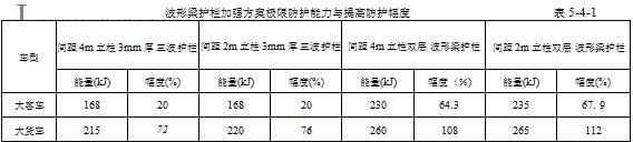 表5-4-1为根据分析结果得到的波形梁护栏加强方案的极限防护能力以及防护能 力提升幅度(与双波梁护栏对大客车的极限防护能力140kJ和对大货车的极限防护能 力125kJ相比较)。 根据表5-4-1,得到以下结论: (1) 间距4m立柱3mm厚三波梁护栏对大客车的极限防护能力为168kJ,对大货车的极限防护能力为215kJ,通过将双波梁护栏更新为间距4m立柱3mm厚三波梁护 栏,对大客车防护能力提高了 20%,对大货车防护能力提高了 72%。 (2) 间距2m立柱3mm厚三波梁护栏对大客车的极限防护能力为168kJ,对大货车的极限防护能力为220kJ,通过将双波梁护栏更新为间距2m立柱3mm厚三波梁护 栏,对大客车防护能力提高了 20%,对大货车防护能力提高了 76%。 (3) 间距4m立柱双层波形梁护栏对大客车的极限防护能力为230kJ,对大货车的极限防护能力为260kJ,通过将双波形梁护栏更新为间距4m立柱双层波形梁护栏,对 大客车防护能力提高了 64.3%,对大货车防护能力提高了 108%。 (4) 间距2m立柱双层波形梁护栏对大客车的极限防护能力为235kJ,对大货车的 极限防护能力为265kJ,通过将双波形梁护栏更新为间距2m立柱双层波形梁护栏,对 大客车防护能力提高了 67.9%,对大货车防护能力提高了 112%。 (5) 间距4m立柱3mm厚三波梁护栏通过碰撞试验验证安全防护性能达到了《新标准》规定的A级160kJ以上,间距2m立柱3mm厚三波梁护栏、间距4m立柱双层波 形梁护栏和间距2m立柱双层波形梁护栏的极限防护能力均大于间距4m立柱3mm 厚三波梁护栏,因此其安全防护性能可达到现行标准规定的A防护等级